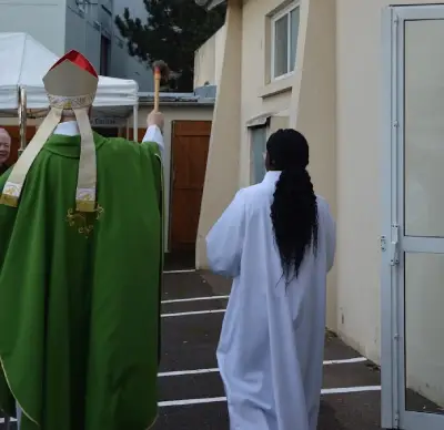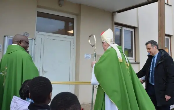 À l’issue de ces deux prises de parole, Monseigneur Crépy a procédé à la bénédiction des locaux et de l’assemblée par aspersion d’eau bénite.